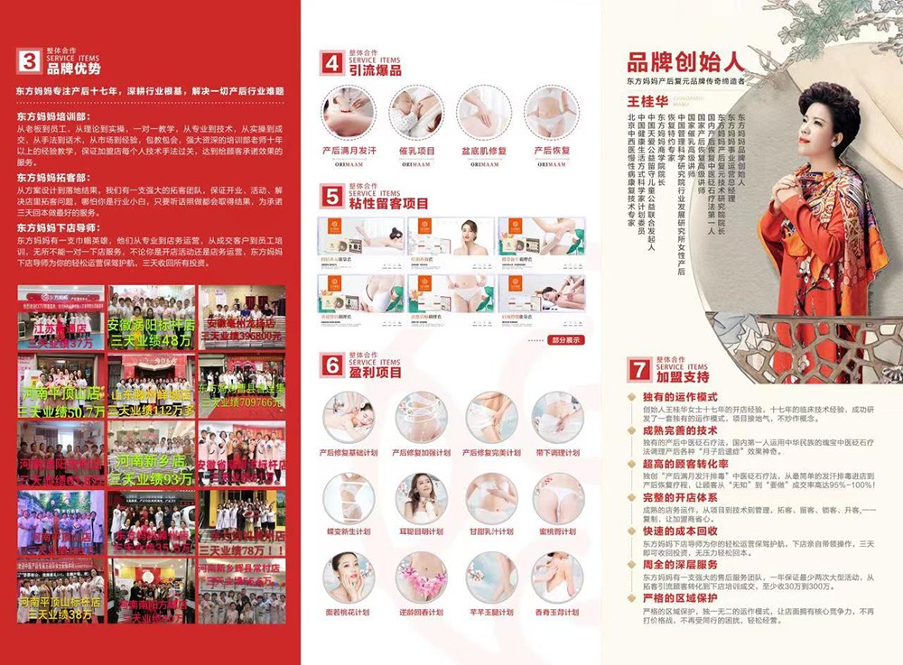 東方媽媽產(chǎn)后復(fù)元服務(wù)主要包含產(chǎn)后復(fù)元、產(chǎn)后體質(zhì)調(diào)理、產(chǎn)后形體恢復(fù)、產(chǎn)后美顏修復(fù)、產(chǎn)后乳房護(hù)理項(xiàng)、以及孕前調(diào)理等6大類、近100項(xiàng)特色服務(wù)。其中產(chǎn)后滿月發(fā)汗排毒,產(chǎn)后開奶催奶,產(chǎn)后溫腰固腎,產(chǎn)后子宮恢復(fù),產(chǎn)后惡露調(diào)理,產(chǎn)后骨盆修復(fù),產(chǎn)后補(bǔ)氣養(yǎng)血,產(chǎn)后十二經(jīng)絡(luò)疏通,產(chǎn)后中醫(yī)體質(zhì)調(diào)理等高端服務(wù)項(xiàng)目十年時(shí)間經(jīng)久不衰,而且東方媽媽因“中醫(yī)產(chǎn)后復(fù)元”特有技術(shù),不僅滿月后可以及時(shí)消除“月子病”,在生產(chǎn)百天、五六年后、甚至較大年齡客戶的遺留癥狀都可以真正解除病痛困擾。十五年磨一劍,十五年時(shí)間已累計(jì)徹底解決了近5000萬媽媽的困擾!隨著效果的顯著和認(rèn)可的人數(shù)越來越多,東方媽媽品牌也不脛而走,很多客戶紛紛前來要求加盟!而東方媽媽除了品牌輸出外,還把技術(shù)、銷售與管理等模塊系統(tǒng)化進(jìn)行通盤輸出,旨在讓加盟商整體導(dǎo)入后,能迅速順利運(yùn)營(yíng)。截止目前在中國(guó)已有1000多家代理加盟商,遍及山東、北京、江蘇、安徽、山西、河南、河北、陜西、遼寧、吉林、黑龍江、廣西、四川、云南、甘肅、新疆、上海等地區(qū)。