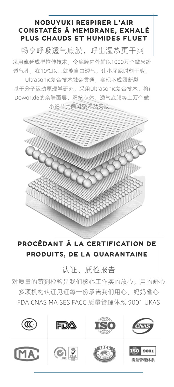 Ultrasonic復(fù)合技術(shù)融會(huì)貫通,實(shí)現(xiàn)不成團(tuán)斷裂;诜肿舆\(yùn)動(dòng)原理學(xué)研究,采用Ultrasonic復(fù)合技術(shù),將iDoworld6的親膚面層、雙核芯體、透氣底膜等上萬(wàn)個(gè)微小細(xì)節(jié)共同凝聚渾然夭成。