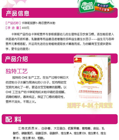 卡咪呢有機(jī)米粉系列是專為中國寶寶設(shè)計(jì)的營養(yǎng)輔食,選用有機(jī)大米,科學(xué)搭配維生素AD等維生素,還特別添加;撬、DHA、AA等有助智力發(fā)育的營養(yǎng)成分,富含15種營養(yǎng)素,F(xiàn)上?ㄟ淠啬笅胗闷酚邢薰久嫦蛉珖瞻资袌(chǎng)區(qū)域誠招卡咪呢有機(jī)米粉代理商。