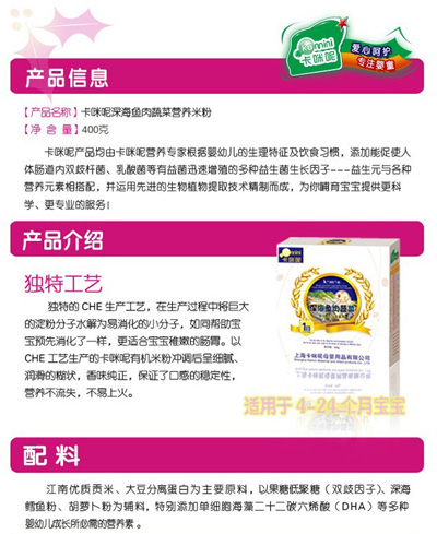 卡咪呢有機米粉系列是專為中國寶寶設計的營養(yǎng)輔食,選用有機大米,科學搭配維生素AD等維生素,還特別添加;撬帷HA、AA等有助智力發(fā)育的營養(yǎng)成分,富含15種營養(yǎng)素,F(xiàn)上?ㄟ淠啬笅胗闷酚邢薰久嫦蛉珖瞻资袌鰠^(qū)域誠招卡咪呢有機米粉代理商。