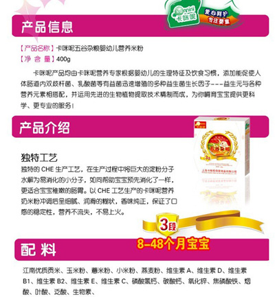 卡咪呢乳清蛋白嬰幼兒營養(yǎng)米粉是上海卡咪呢母嬰用品有限公司旗下產(chǎn)品,精選優(yōu)質(zhì)大米制作,特別添加乳清蛋白和益生元,提高寶寶抵抗力,促進寶寶changdao的消化吸收,上市以來廣受父母消費者的青睞。