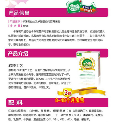 卡咪呢乳清蛋白嬰幼兒營養(yǎng)米粉是上海卡咪呢母嬰用品有限公司旗下產(chǎn)品,精選優(yōu)質(zhì)大米制作,特別添加乳清蛋白和益生元,提高寶寶抵抗力,促進(jìn)寶寶changdao的消化吸收,上市以來廣受父母消費(fèi)者的青睞。