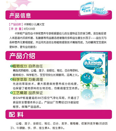 卡咪呢小兒板藍(lán)根顆粒是上?ㄟ淠啬笅胗闷酚邢薰酒煜庐a(chǎn)品,專為嬰幼兒設(shè)計(jì),專業(yè)、安全,幫助寶寶可以預(yù)防感冒抵抗病毒,是廣大父母育兒的好幫手?ㄟ淠匦喊逅{(lán)根顆粒不含任何色素、防腐劑,安全放心。