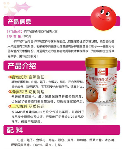 卡咪呢小兒板藍(lán)根顆粒是上?ㄟ淠啬笅胗闷酚邢薰酒煜庐a(chǎn)品,專為嬰幼兒設(shè)計(jì),專業(yè)、安全,幫助寶寶可以預(yù)防感冒抵抗病毒,是廣大父母育兒的好幫手?ㄟ淠匦喊逅{(lán)根顆粒不含任何色素、防腐劑,安全放心。