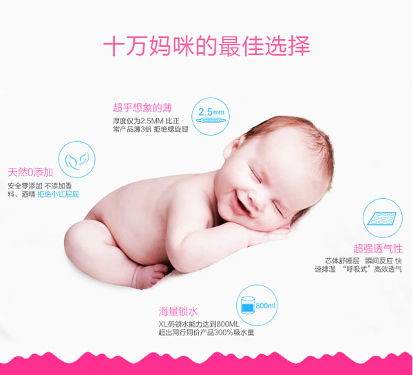 360°彈力貼身腰圍,超柔、超舒適。超柔3D打孔大珍珠面層,有效減少皮膚接觸,清新干爽,呵護(hù)寶寶小屁屁。干爽升級,雙層舒爽芯,進(jìn)口住友+三大雅高分子完美配比,瞬間吸收、牢固鎖水。熱風(fēng)新微孔高效排氣底膜,及時(shí)排除悶熱濕氣。 遇濕變色魔幻尿顯,及時(shí)發(fā)現(xiàn)寶寶的小秘密。自動(dòng)外翻立體防側(cè)漏隔邊,防止側(cè)漏,寶媽更放心。根據(jù)中國寶寶體型設(shè)計(jì),貼合臀部曲線,伸展自如。