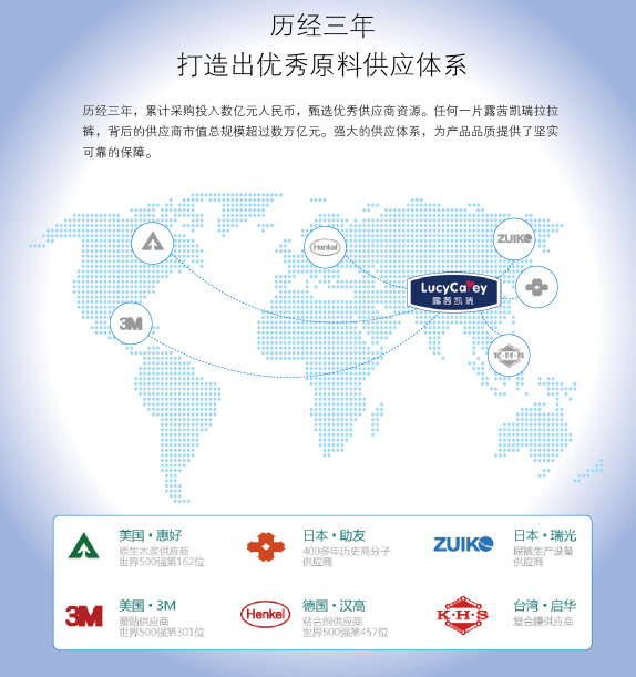 LUCYCAREY露茜凱瑞成長褲選用全球頂尖供應(yīng)商的紙尿褲原材料:住友、三大雅高分子吸水材料;美國3M魔術(shù)貼;德國萊卡松緊帶;美國進(jìn)口原生木漿;德國漢高粘合劑;美國、日本進(jìn)口無紡布;進(jìn)口超柔軟透氣底膜等。另外,全世界zui先進(jìn)的全自動(dòng)紙尿褲生產(chǎn)線,年產(chǎn)銷數(shù)億片紙尿褲的成熟的生產(chǎn)制造團(tuán)隊(duì),確保產(chǎn)品高品質(zhì)。
