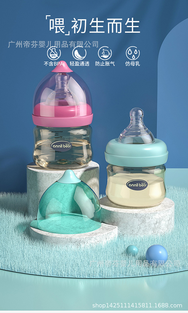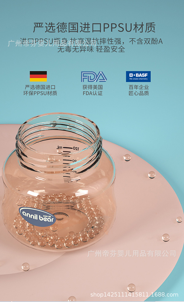 安奈小熊標口PES奶瓶瓶身采用PES材質(zhì),質(zhì)地輕,耐高溫180度,安全無毒,不易破碎。