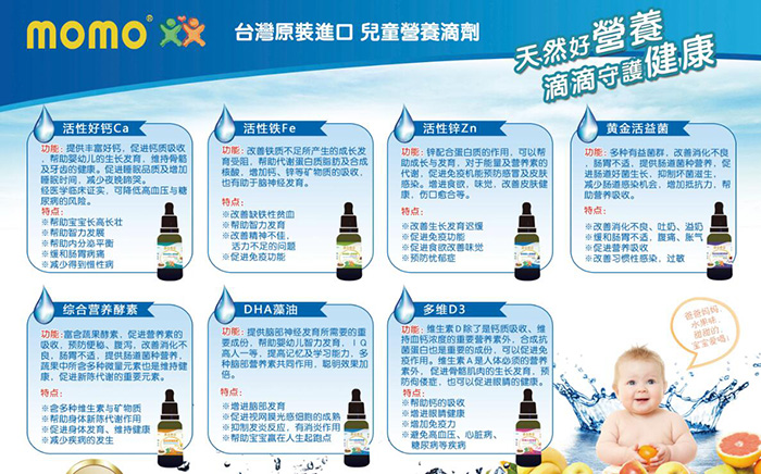 momo營(yíng)養(yǎng)素滴劑系列,100%臺(tái)灣原罐原裝,正規(guī)進(jìn)口食品,安全有保障。臺(tái)灣專(zhuān)業(yè)研發(fā)團(tuán)隊(duì),采用本土原材料,采用嚴(yán)格的自我生產(chǎn)管理系統(tǒng),從 產(chǎn)品開(kāi)發(fā)、原來(lái)生產(chǎn)到末端產(chǎn)品的包裝,提供完整的品質(zhì)服務(wù),F(xiàn)正面向全國(guó)招商中,有意向者現(xiàn)在就可以通過(guò)火爆嬰童網(wǎng)進(jìn)行留言咨詢(xún)。