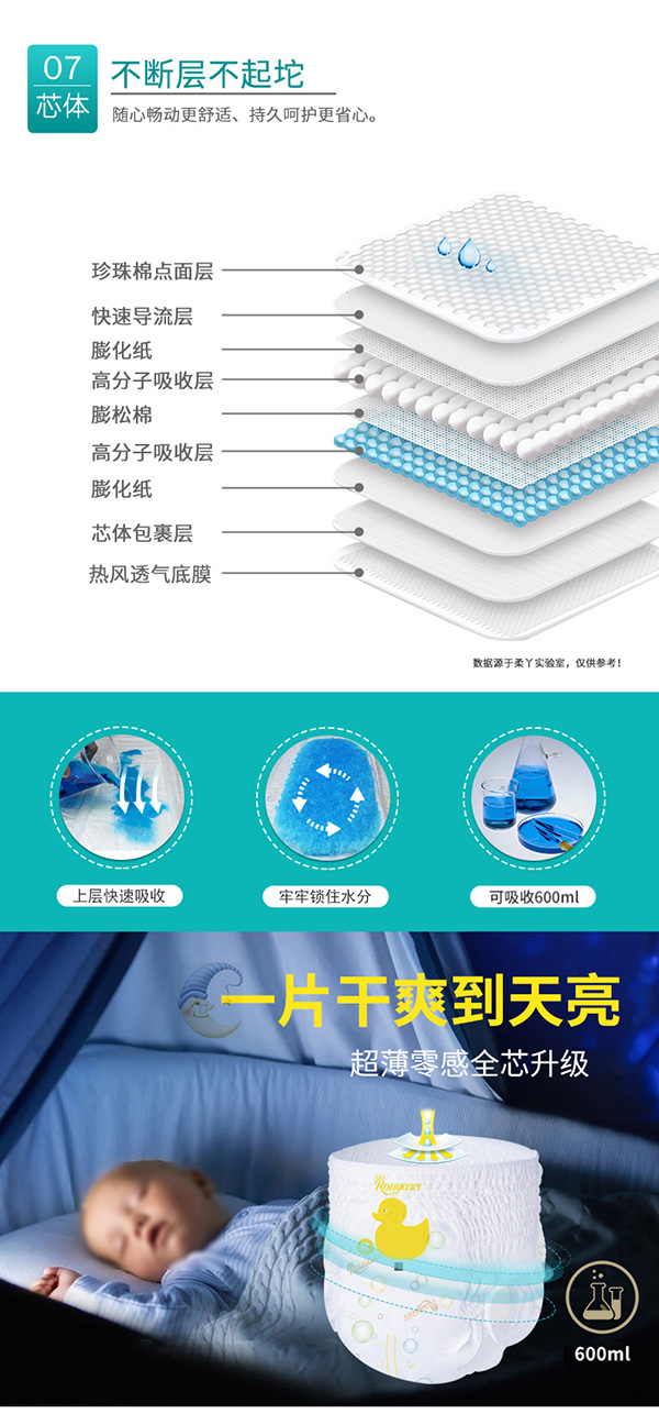 進口高分子結構,可以吸收約自身重量30倍的水分,保持屁屁持久干爽