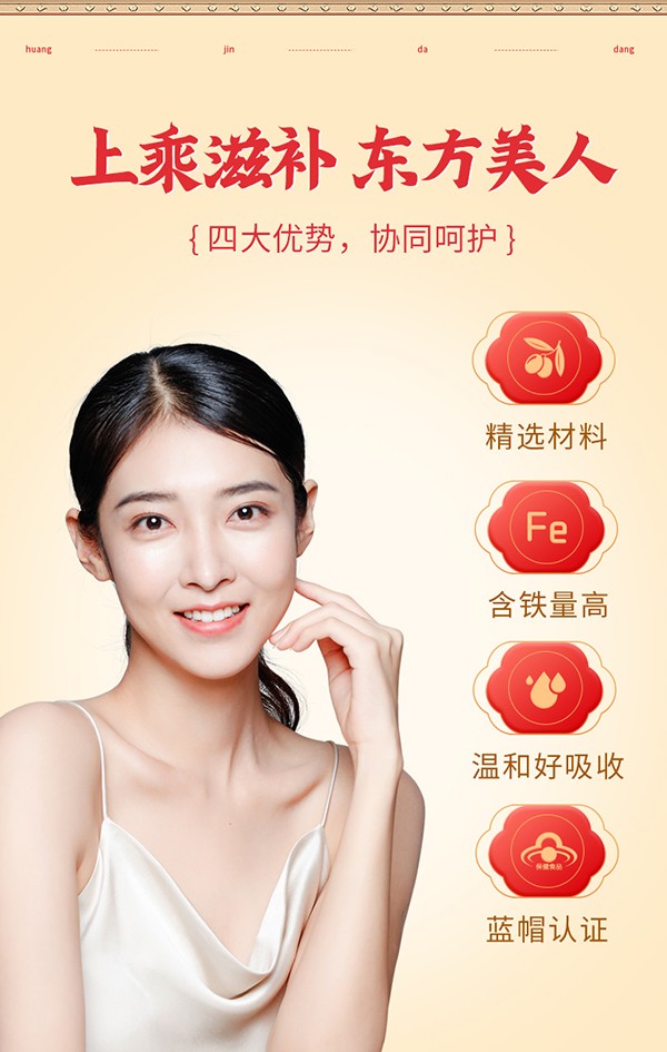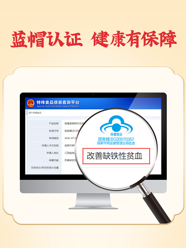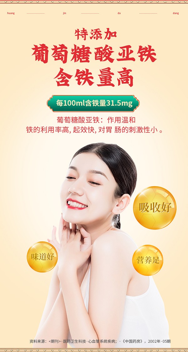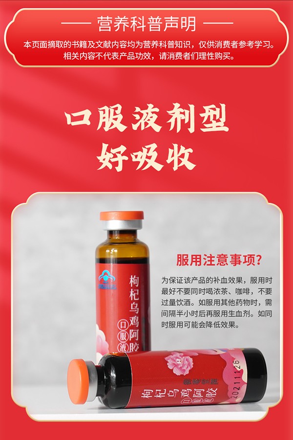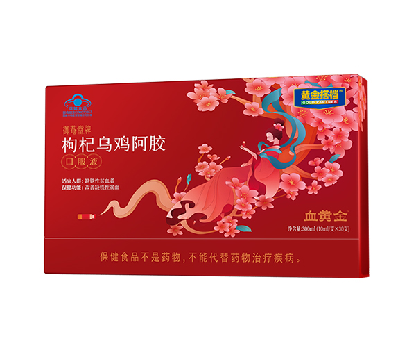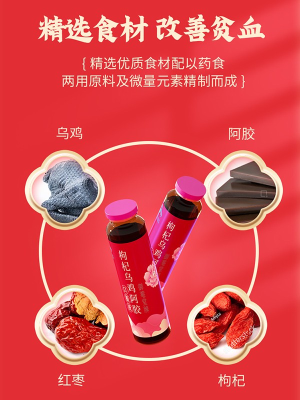 黃金搭檔枸杞烏雞阿膠口服液,藍(lán)帽保健食品,為缺鐵性貧血者精心研制!專注補鐵補血,名副其實的“血黃金”!精選優(yōu)質(zhì)食材配以藥食兩用原料,如烏雞、枸杞子、大棗、阿膠以及葡萄糖酸亞鐵等等,同時添加多種微量元素,營養(yǎng)成分含量更高,更均衡!每100ml含鐵31.5mg,含粗多糖61mg,上乘滋補,溫和好吸收,喚醒好氣色!
