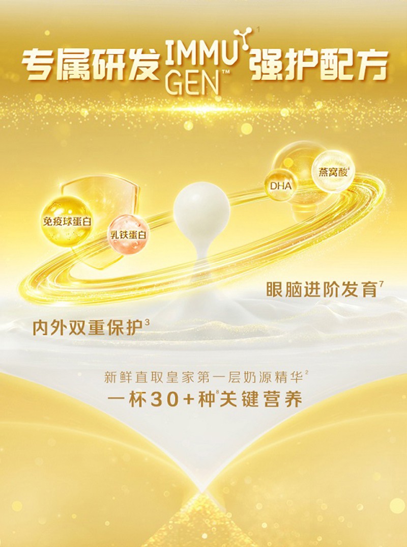 皇家美素佳兒旺玥兒童營養(yǎng)奶粉 ,荷蘭原產(chǎn)原裝原罐進(jìn)口 ,新鮮直取皇家第一層奶源精華,天然含有OPO類似結(jié)構(gòu)脂,好消化易吸收。成分突破性含有免疫球蛋白 ,不額外添加蔗糖和香精,天然奶香,口味清淡。乳鐵蛋白和免疫球蛋白 ,雙護(hù)強(qiáng)健體質(zhì)。DHA和燕窩酸 ,雙管齊下 ,賦能眼腦進(jìn)階發(fā)育。一杯30多種關(guān)鍵營養(yǎng) ,提供孩子全面成長所需。助力孩子釋放天性 ,破圈成長!