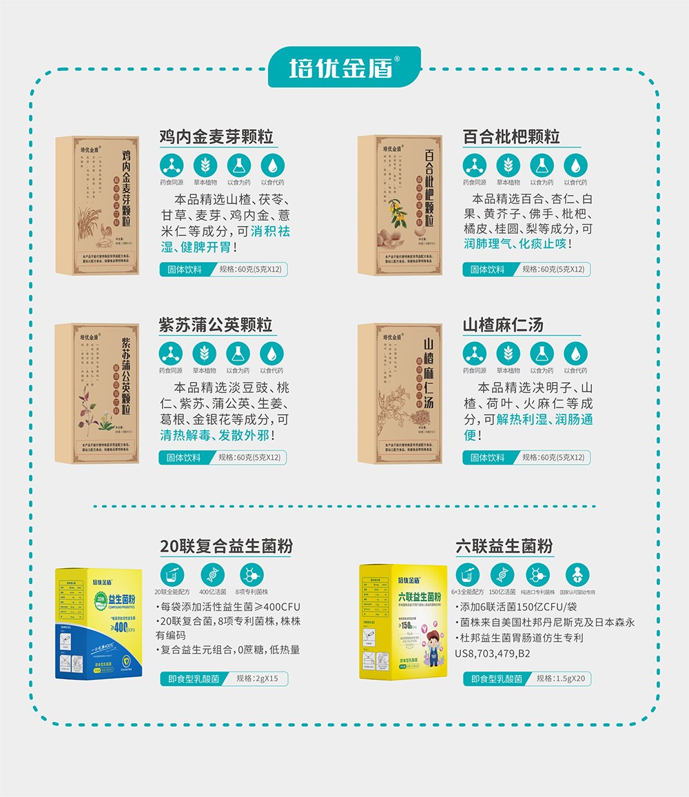 品牌名稱:培優(yōu)金盾 主營產(chǎn)品:培優(yōu)金盾藥食同源顆粒,培優(yōu)金盾益生菌 品牌特色:嚴格選材 科學配比