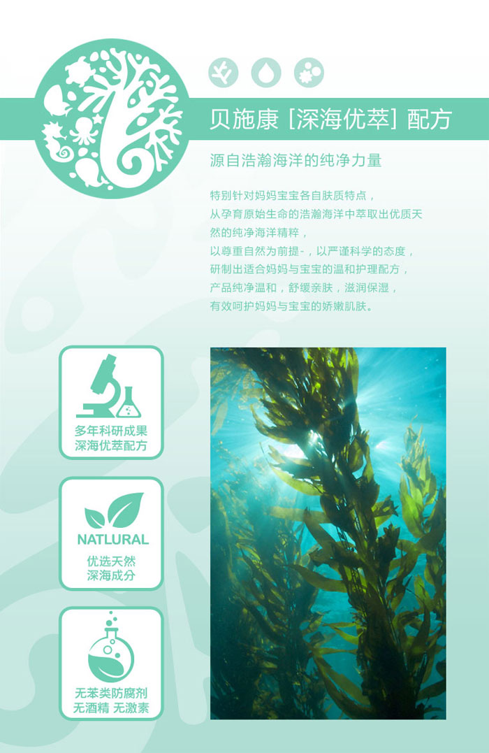 貝施康從浩瀚深海中發(fā)現(xiàn)護膚能量,依托國際一流科研技術(shù),以尊重自然環(huán)境為宗旨,源源不斷為寶寶和媽媽的肌膚研制出天然優(yōu)質(zhì)舒適的護理產(chǎn)品, 讓寶寶和媽媽享受源自深海的健康守護。 特別針對媽媽寶寶各自膚質(zhì)特點, 從孕育原始生命的浩瀚海洋中萃取出優(yōu)質(zhì)天然的純凈海洋精粹, 以尊重自然為前提-,以嚴謹科學(xué)的態(tài)度, 研制出適合媽媽與寶寶的溫和護理配方, 產(chǎn)品純凈溫和,舒緩親膚,滋潤保濕, 有效呵護媽媽與寶寶的嬌嫩肌膚。