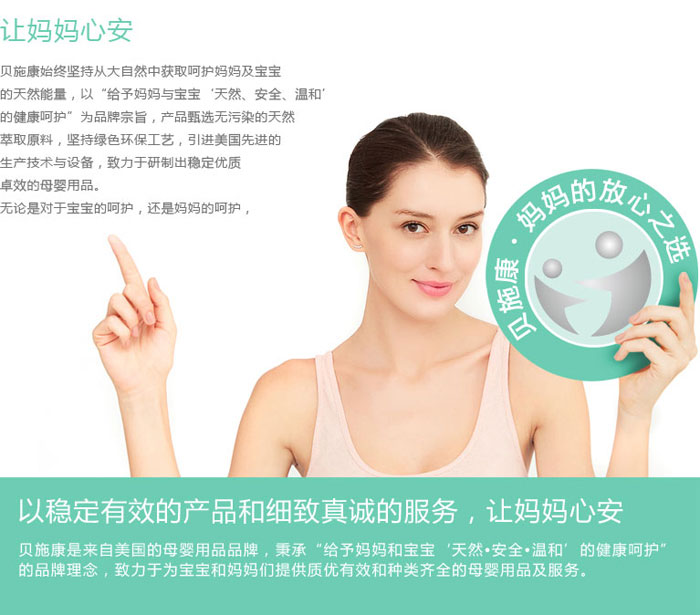 品牌理念:讓媽媽心安 貝施康始終堅持從大自然中獲取呵護媽媽及寶寶的天然能量,以“給予媽媽與寶寶‘天然、安全、溫和’的健康呵護”為品牌宗旨,產(chǎn)品甄選無污染的天然萃取原料,堅持綠色環(huán)保工藝,引進美國先進的生產(chǎn)技術(shù)與設(shè)備,致力于研制出穩(wěn)定優(yōu)質(zhì)卓效的母嬰用品。無論是對于寶寶的呵護,還是媽媽的呵護,以穩(wěn)定有效的產(chǎn)品和細致真誠的服務(wù),讓媽媽心安貝施康是來自美國的母嬰用品品牌,秉承“給予媽媽和寶寶‘天然?安全?溫和’的健康呵護”的品牌理念,致力于為寶寶和媽媽們提供質(zhì)優(yōu)有效和種類齊全的母嬰用品及服務(wù)。