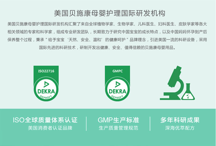 研發(fā)背景:來自美國科研團隊的嚴苛負責(zé)全線產(chǎn)品均遵循國際生產(chǎn)標準 給予寶寶安全舒適的呵護 美國貝施康母嬰護理國際研發(fā)機構(gòu)匯聚了來自全球植物學(xué)家、生物學(xué)家、兒科醫(yī)生、婦科醫(yī)生、皮膚學(xué)家等各大相關(guān)領(lǐng)域的專家和科學(xué)家,組成專業(yè)研發(fā)團隊,長期致力于研究中國寶寶的成長特點,以及中國媽媽懷孕到產(chǎn)后保養(yǎng)整個過程,秉承“給予寶寶‘天然、安全、溫和’的健康呵護”品牌理念,引進美國一流的科研設(shè)備,采用國際先進的科研技術(shù),研制開發(fā)出健康、安全、值得信賴的貝施康母嬰用品。