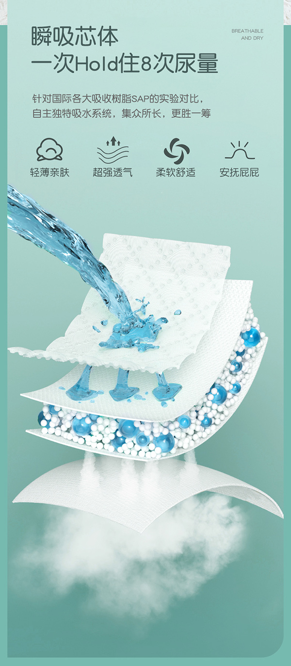 麥卡米卡慕斯超芯體紙尿褲,第4代“超芯”,更薄、更快、更干爽、更安全!獨(dú)創(chuàng)芯體U型槽,吸收更快,更大容量;超聲波壓合云朵凸點(diǎn)面層,減少皮膚接觸面,遠(yuǎn)離紅屁股;大環(huán)腰體貼腰圍,防漏不勒紅;立體雙層防漏,護(hù)圍拉伸自動(dòng)外翻設(shè)計(jì),有效防止側(cè)漏;0.1cm超薄芯,一片尿褲反鎖整夜尿量;臺(tái)灣進(jìn)口面層,立體打孔,輕松吸收,迅速把干;醫(yī)護(hù)級(jí)紙尿褲,多國(guó)檢測(cè)認(rèn)證,安全放心。
