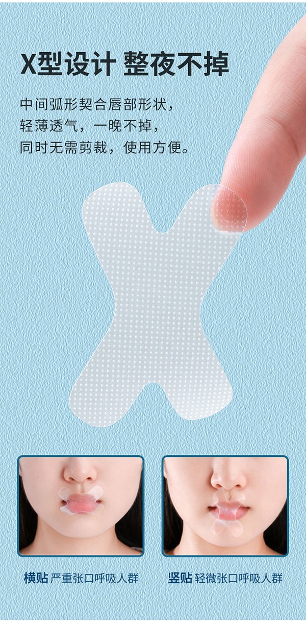閉口貼,X型設計,整夜不掉,中間弧形契合唇部形狀,輕薄透氣,一晚不掉,同時無需剪裁,使用方便。輕薄透氣不悶汗,拒絕口呼吸,讓你每夜安眠;溫和剝離,不留殘膠,敏感肌可用,清潔安心。