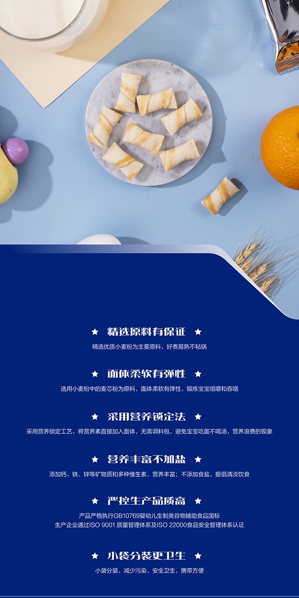 優(yōu)質麥粉及新鮮雞蛋;不添加香精、色素、防腐劑。百年工藝,鈣鐵鋅強化,營養(yǎng)更全面。