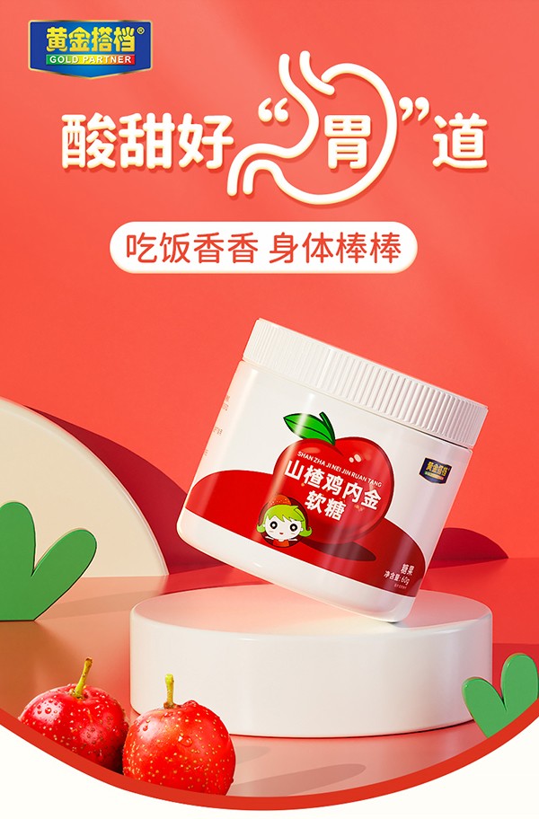 黃金搭檔山楂雞內金軟糖,植物草本配方,綠色安全!精選果實飽滿的優(yōu)質山楂為原料,更添加雞內金提取物、維生素C等,科學配比,美味營養(yǎng)!以麥芽糖醇代替蔗糖,降低甜度,呵護幼齒!顆顆獨立包裝,干凈衛(wèi)生易攜帶,拆袋即食,酸甜口感,拯救“小飯渣”,讓孩子“食”力全開,茁壯成長!