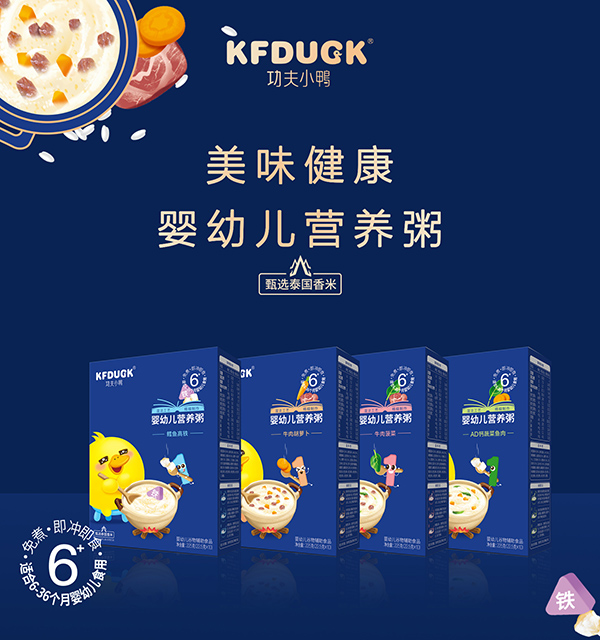 功夫小鴨嬰幼兒營養(yǎng)粥系列,有AD鈣蔬菜魚肉、牛肉菠菜、牛肉胡蘿卜、鱈魚高鐵,共四款單品,均選優(yōu)質(zhì)原料制作,搭配多種新鮮食材,營養(yǎng)豐富,口感美味。
