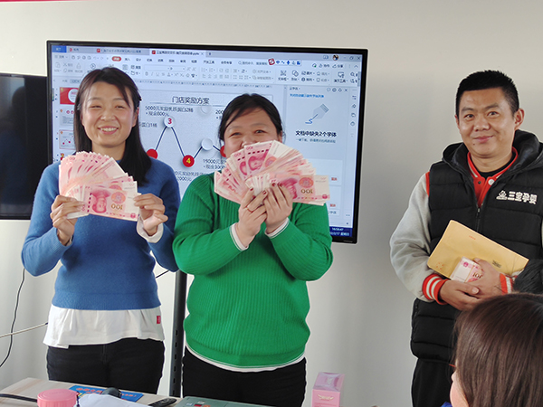 除了新品的講解,“施貝安”品牌針對線下門店所推出的門店獎勵方案亦是誠意滿滿,給銷售冠軍們的獎勵更是絲毫不含糊!白花花的百元大鈔送到各位銷售精英的手中,看著她們一個個洋溢著幸福的笑臉,亦是對“施貝安”品牌的高度認可!