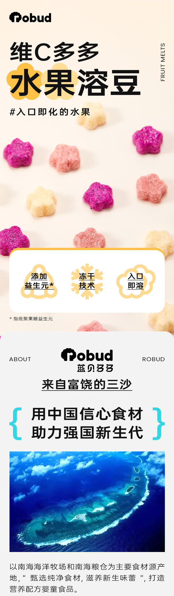 在新時代消費(fèi)群體的健康理念下,90后00后的家長們更加注重寶寶入口零食的健康。對此藍(lán)貝多多兒童零食,一直專注于兒童入口的嬰童零輔食的健康與營養(yǎng),深入研究,注重生產(chǎn)的每一個細(xì)節(jié),用上乘的品質(zhì)征服了眾多消費(fèi)者與經(jīng)銷商的心。這款藍(lán)貝多多維C多多水果溶豆產(chǎn)品更是深受消費(fèi)者的喜愛。